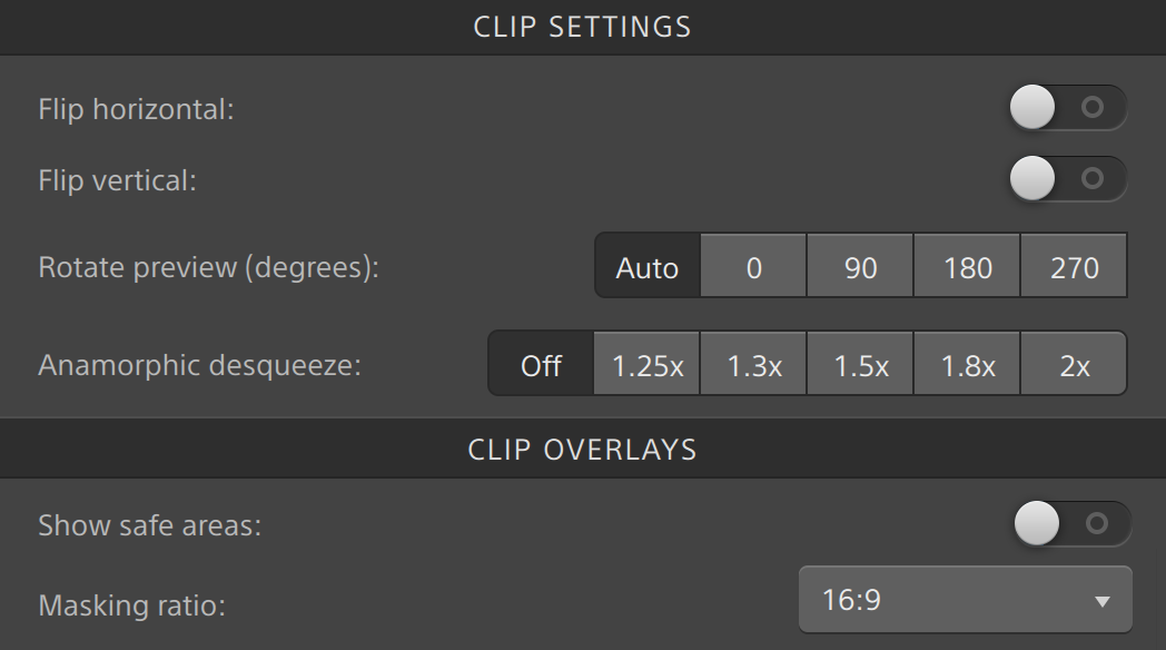 Select a button to rotate the video preview image. Select Auto to use the clip-rotation metadata setting if available, or select 0, 90, 180, or 270 to specify the desired clip rotation. |