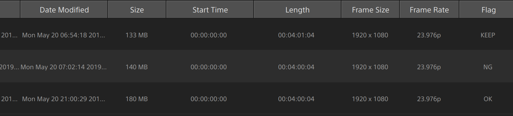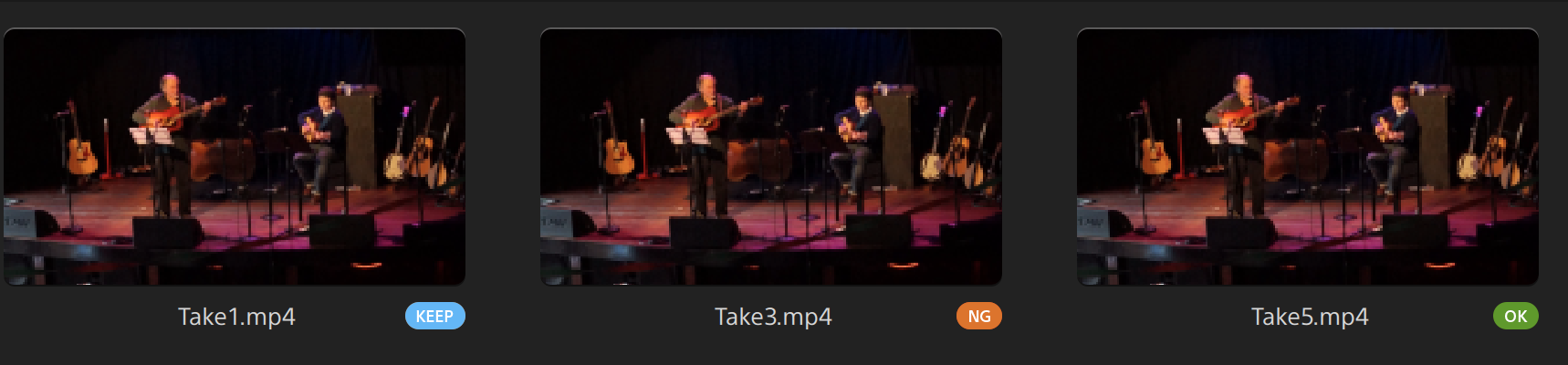 When a clip has Flag metadata, an OK, NG (no good), or Keep indicator is displayed in Organize mode: